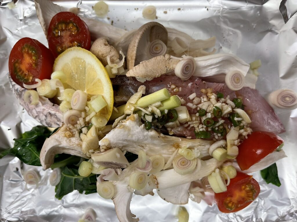 アルミホイルを大きく広げ、魚丸ごとはそのまま、切り身は皮を下にして置く。さらに、きのこ、にんにく、 トマト(生またはドライ)、レモングラス(生は輪切りスライスにして、またはドライ)、香草(パクチーまたは明日葉)、レモンをのせ、 ナンプラーをたらして包む。破れないように注意(二重にしても良い)