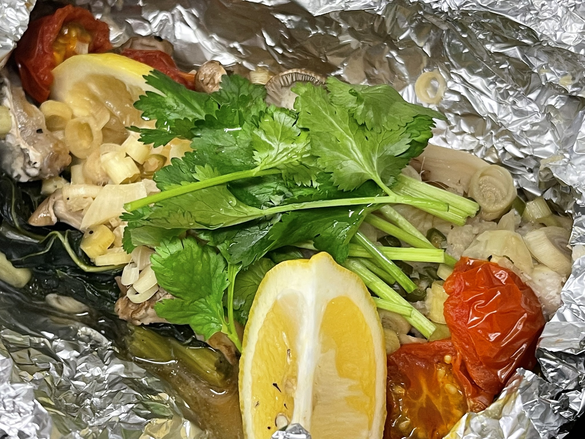 香草(パクチーまたは明日葉)、トマト(生またはドライ)、レモングラス(生またはドライ)、きのこ、にんにく、レモン、島とうがらし、アルミホイル