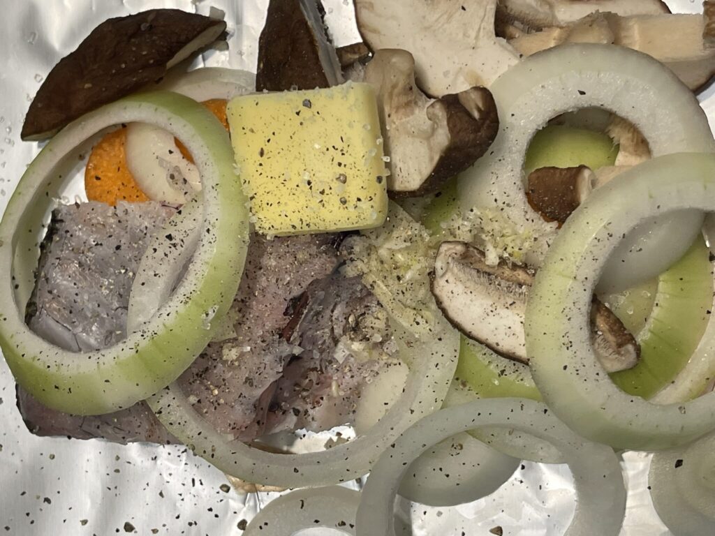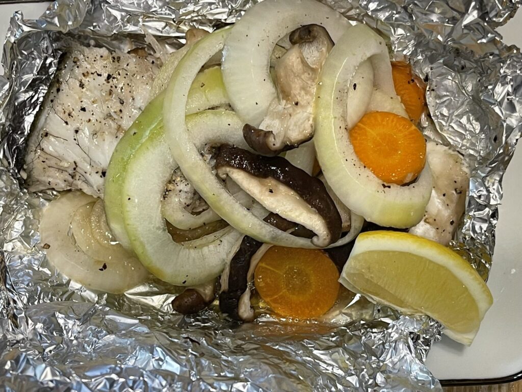アルミホイルを大きく広げ、魚丸ごとはそのまま、切り身は皮を下にして置く。横に人参、上に玉ねぎやきのこ、にんにく、バターをのせ、塩胡椒して包む。破れないように注意(二重にしても良い)