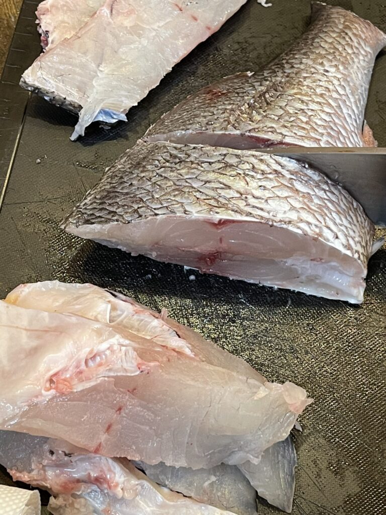 ※ご自分で式根島養殖場に注文して、うろこ、内臓、エラ取りまで下処理し、切り身にしてから、塩を軽くふって5 分おき、出てきた水気をクッキングペーパーで取っておく