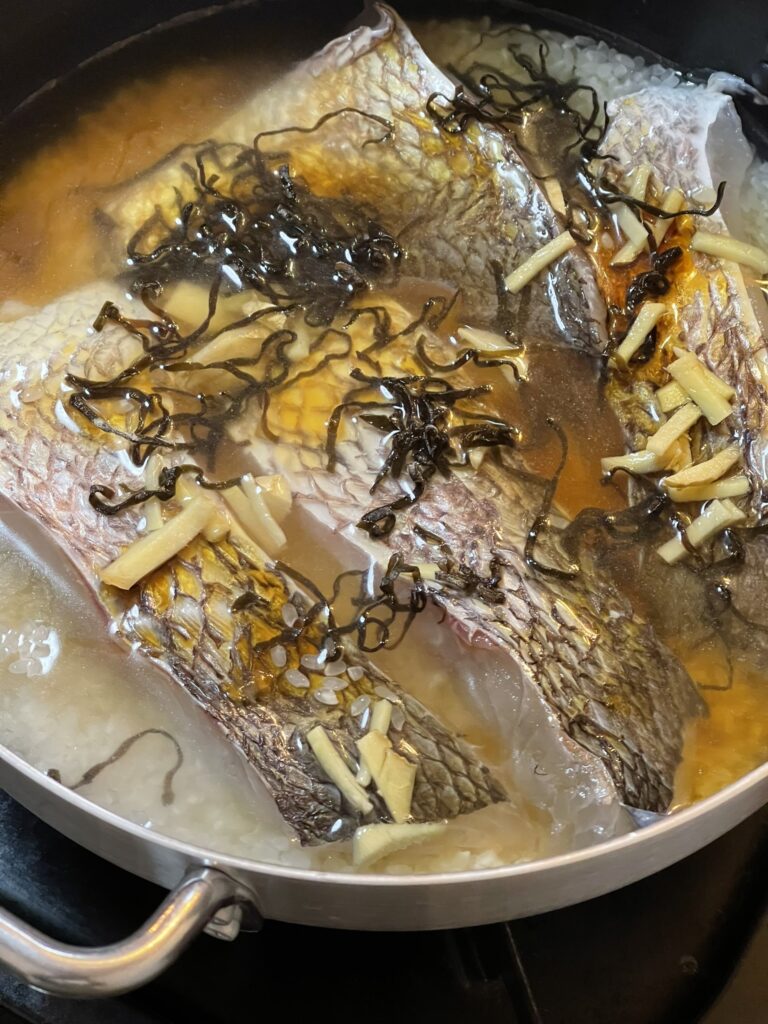 1に式根鯛平君と生姜、塩昆布を1に載せ、ふたをして、強火にする。沸騰したら消えない程度の超弱火で 15 分加熱する(キッチンタイマーをかけておくと安心)。さらに仕上げに1分強火で加熱しておこげを作る。