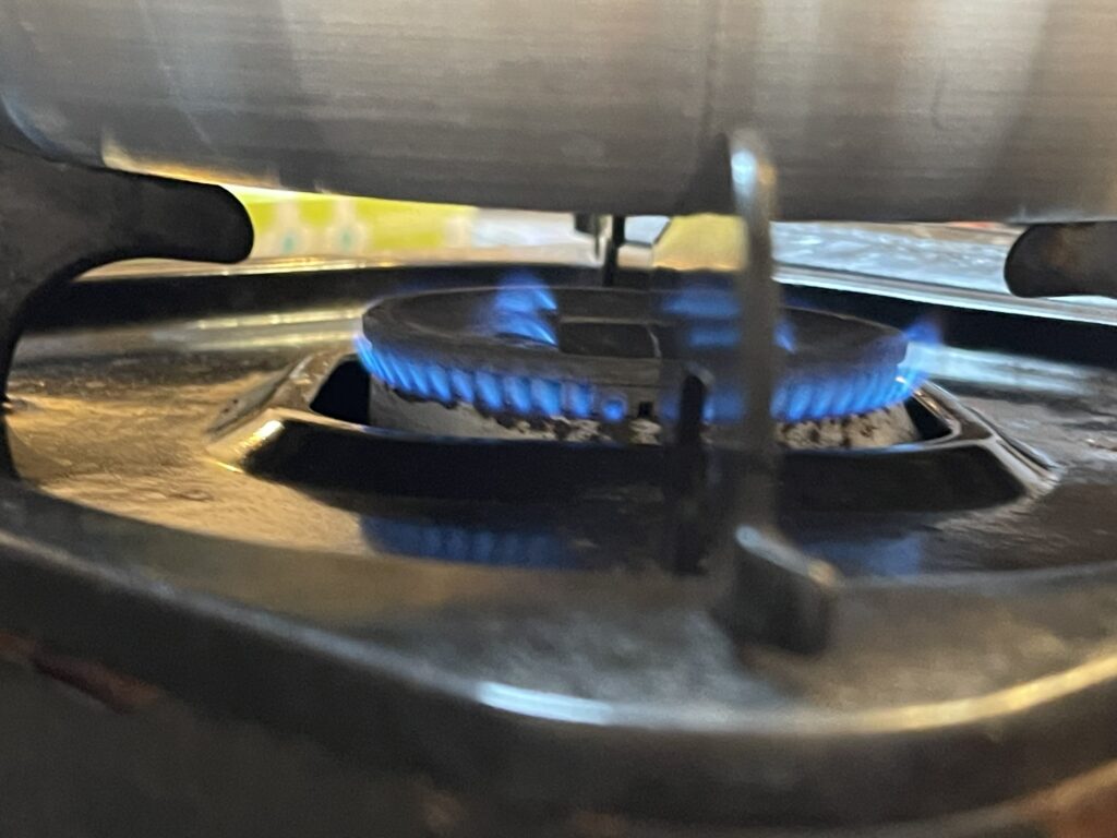 カセットコンロに両手鍋を置き、無洗米3合と計量カップで量った水 600ml、カップの合わせ調味料を全て入れる。時間があれば、ここで10分~くらいおいて吸水させてもよい。