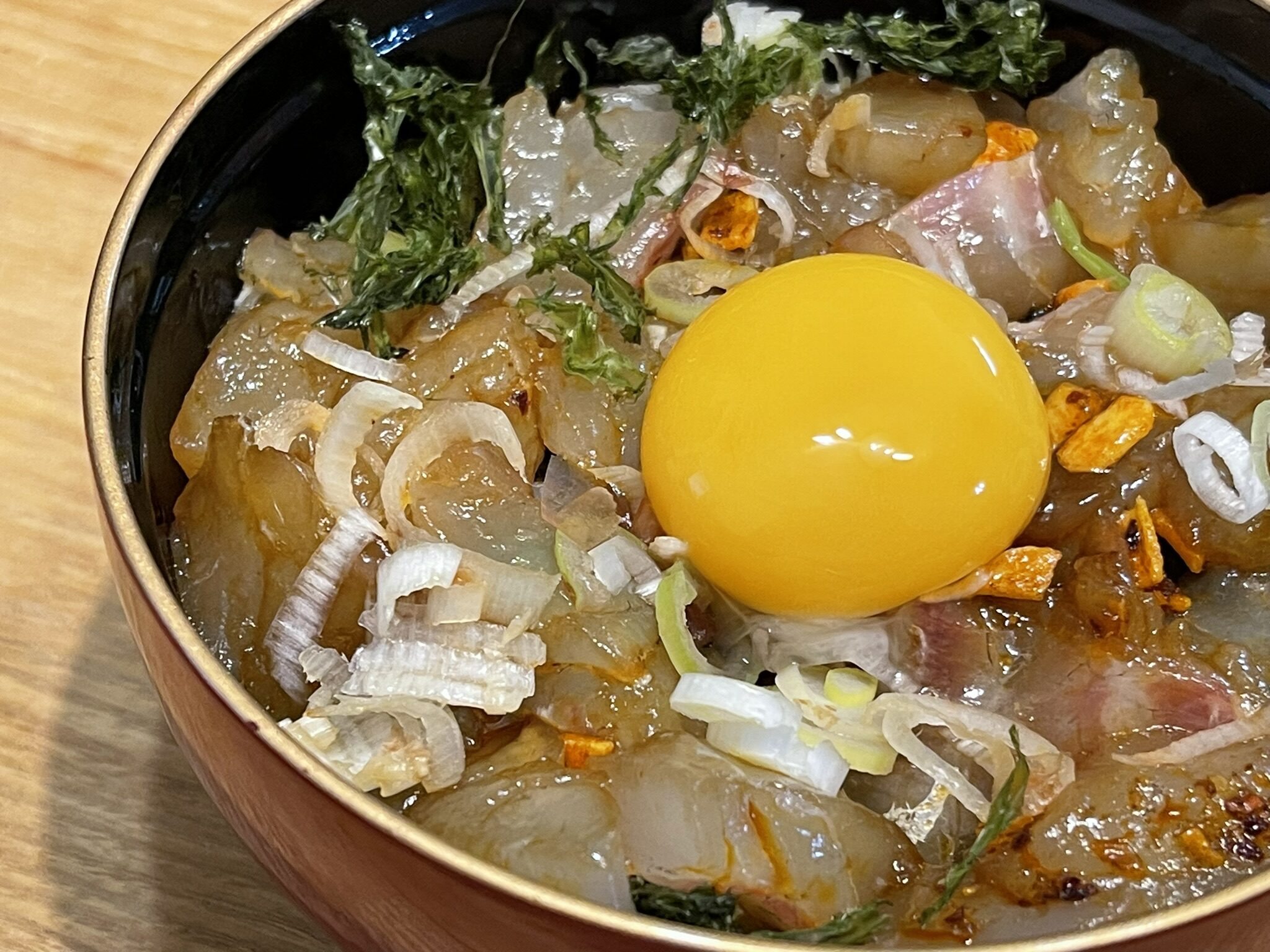 2の刺身を1の上に重ならないように並べ、生卵の黄身だけ(または温泉たまご)と薬味をのせて出来上がり。